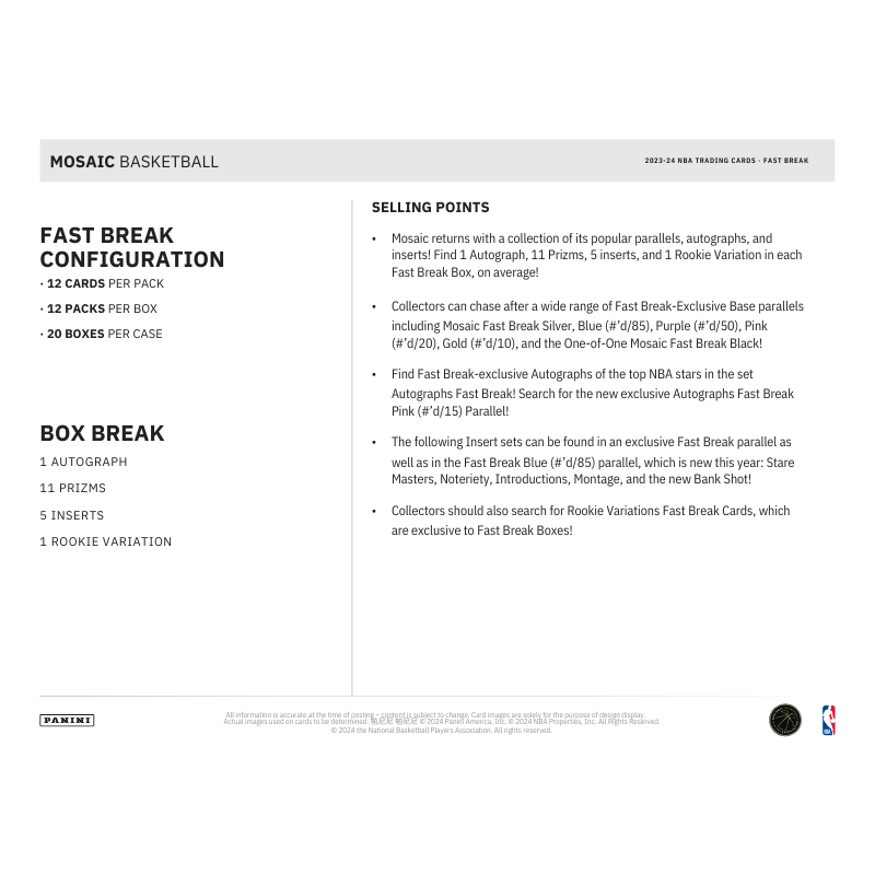 • Mosaic returns with a collection of its popular parallels, autographs, and inserts! Find 1 Autograph, 11 Prizms, 5 inserts, and 1 Rookie Variation in each Fast Break Box, on average!