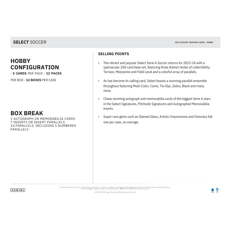 - The vibrant and popular Select Serie A Soccer returns for 2023-24 with a spectacular 250-card base set, featuring three distinct levels of collectability: Terrace, Mezzanine and Field Level and a colorful array of parallels.