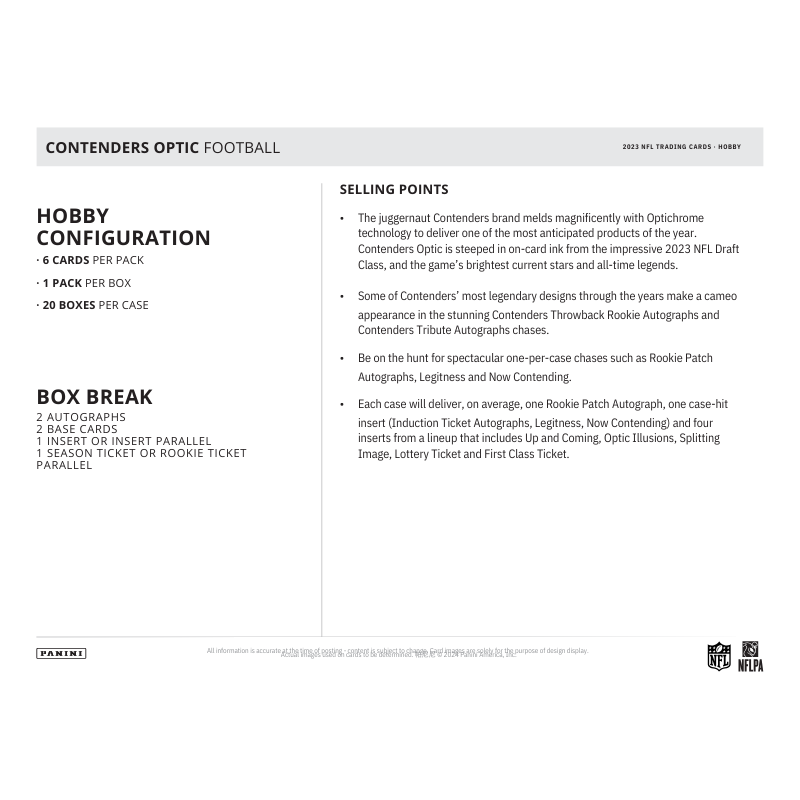 • The juggernaut Contenders brand melds magnificently with Optichrome technology to deliver one of the most anticipated products of the year. Contenders Optic is steeped in on-card ink from the impressive 2023 NFL Draft Class, and the game’s brightest current stars and all-time legends.