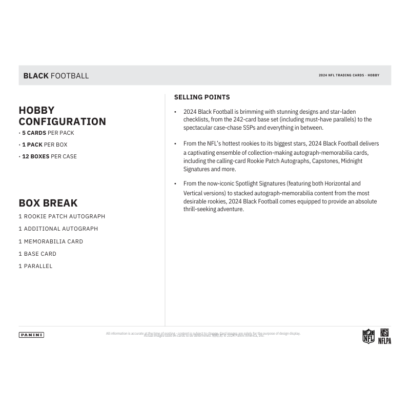 • From the now-iconic Spotlight Signatures (featuring both Horizontal and Vertical versions) to stacked autograph-memorabilia content from the most desirable rookies, 2024 Black Football comes equipped to provide an absolute thrill-seeking adventure.